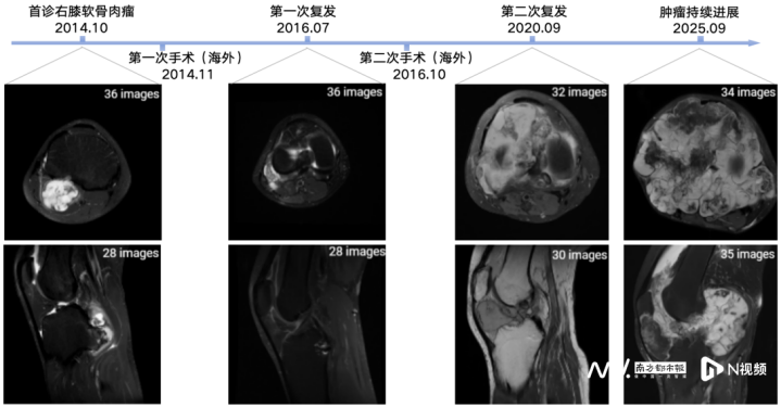 患者既往手术及复发时间轴。在2025年9月的影像中可以看到,肿瘤已经占据了95%以上的膝关节腔。